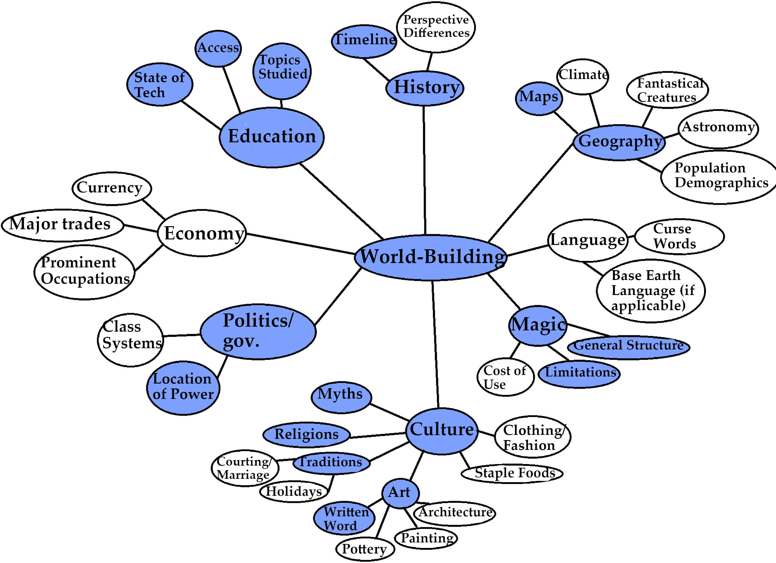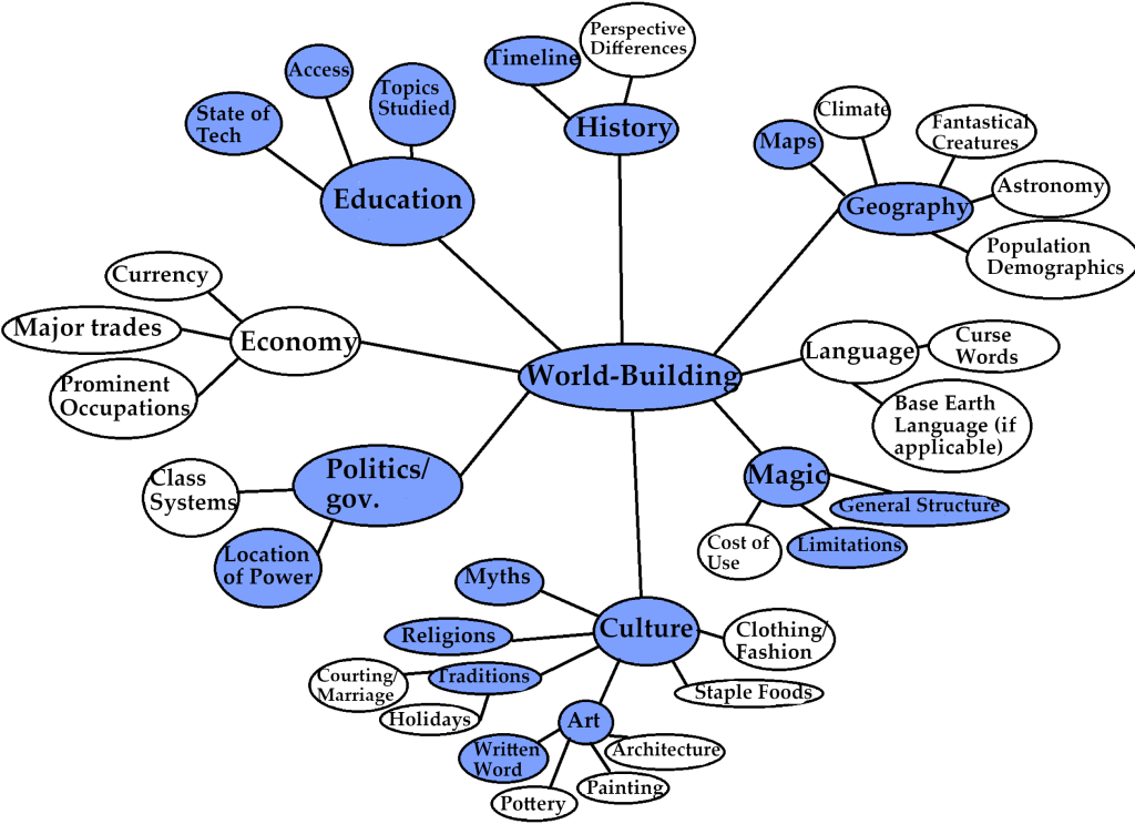 Above is a world-building web that features what I hope is most, if not all, of the various elements that one can consider when creating a fantasy world for your book. If I’m missing any, though, please let me know below.