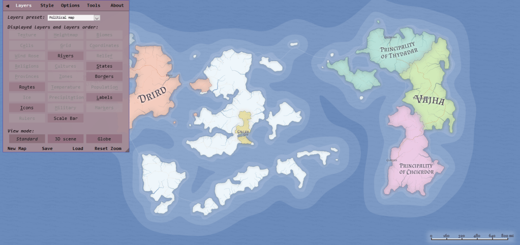 Azgaar’s Fantasy Map Generator–This functions as an image generator for the global scale. There are options for customization, including adjustments to the number of countries and cultures you want to include, and there are ways to adjust the scope. The map shown below is one generated as an archipelago, but there are options for islands, peninsulas, double continents, and so on. And, of course, it allows you to edit the names generated to fit on that map. It’s worth mentioning that I never wound up using this generator, primarily because I already had my own hand-drawn one.