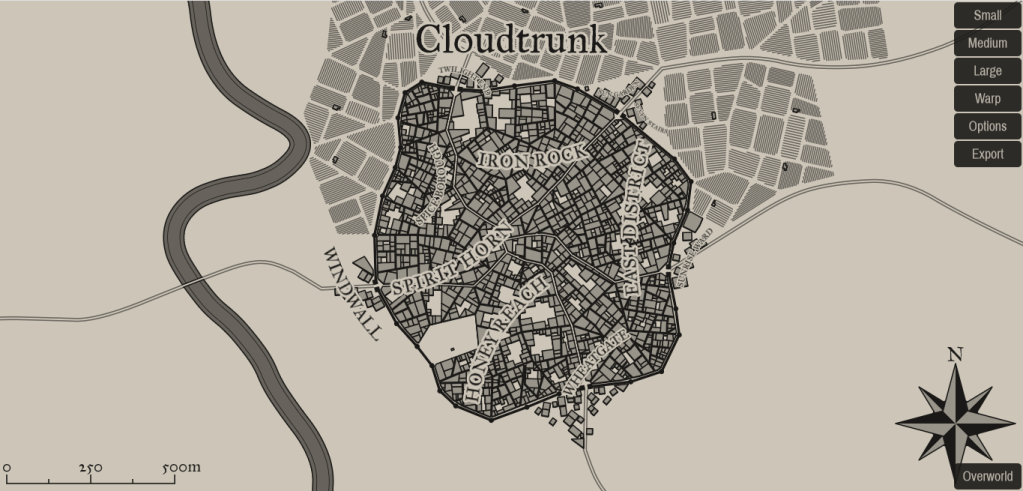 Medieval Fantasy City Generator–While I actually found this generator before the Azgaar’s one, and used it extensively, it is worth saying at the offset that if you click on a city in your new Azgaar’s map, there is an icon that takes you to this city generator, already preset to fit the size of the population and the geography of the Azgaar’s map. Like the Azgaar’s map, there are customization options, though because it is on a smaller scale, there are fewer options. You can edit the size, whether there are walls or not, and so forth. Of course, again, you can also change the names generated for the map. It’s not as versatile as I would have generally liked, but it was incredibly useful for keeping the scope of my cities and towns in mind. And, because it’s far harder to draw something like this than it is to draw a country’s outline, I’ll take what I can get.