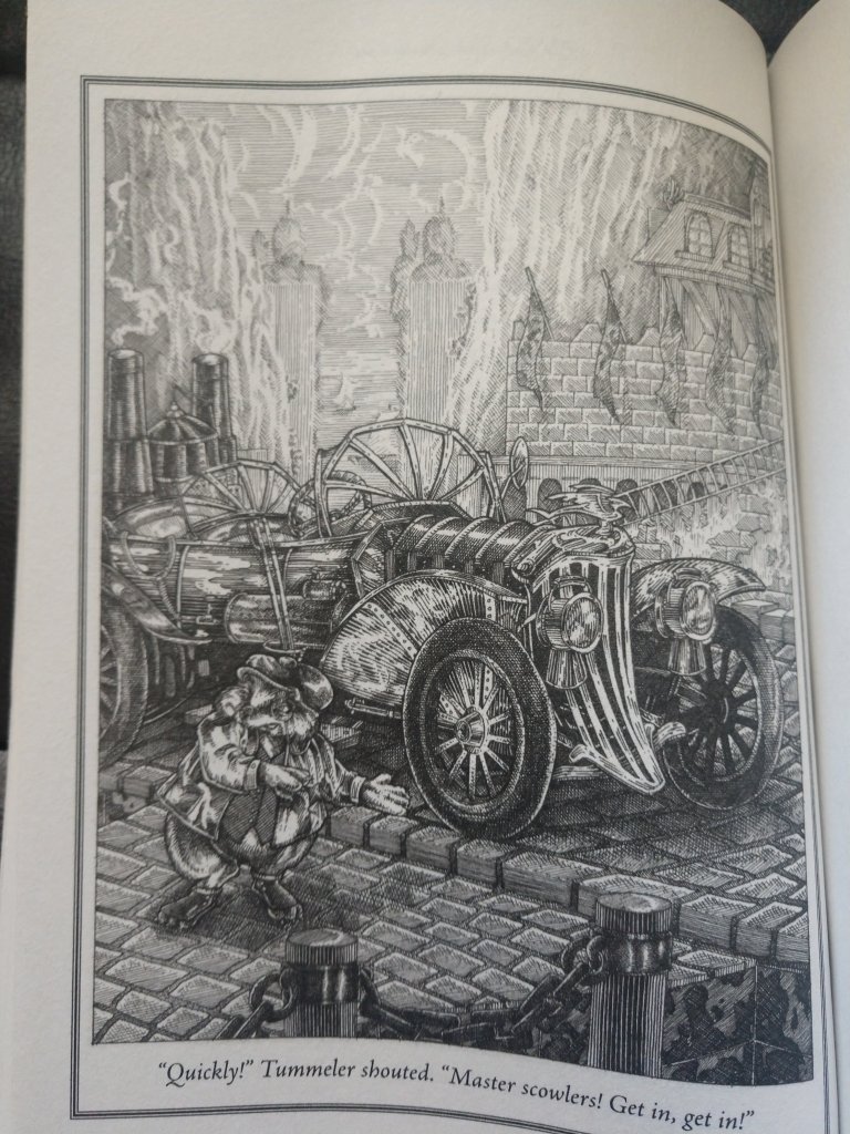 Disappointingly, the line between good and evil is apparent in the clothing they are shown to be wearing. Naturally, the main characters are wearing clothes befitting England in the middle of WWI, but the other “good” characters continue the fashion of your traditional medieval-ish English/European styles, as seen on Tummeler above and the Parliament below. However, compare those to the “chinese”-styled Goblins, who turn to the side of the antagonist. Compare the depictions of The Winter King and The Cartographer of Lost Places, who, in later books, are revealed to be siblings from the same time period.